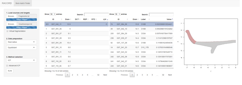 Abstract: Archaeologists working with pottery spend a considerable amount of time on a fundamental task – providing precise descriptions of pottery fragments. This study presents a survey of existing computational solutions to identify the best matches for a given fragment, based on its shape. Four methods (ICP, DCT, RDP, and RTC) are compared, using a pottery dataset from Graufesenque (southern France), dated to the Roman Period. The first three methods produced successful and very similar results for rim fragments (within the five best candidates for 95% of the dataset). The ICP algorithm produced the best overall results for rim fragments, and can also be used for non-rim fragments. A practical computer application, including all the above methods, was developed in R programming language, with an easy-to-use graphical interface, and is now made freely available to the archaeological community for future studies, and further development.